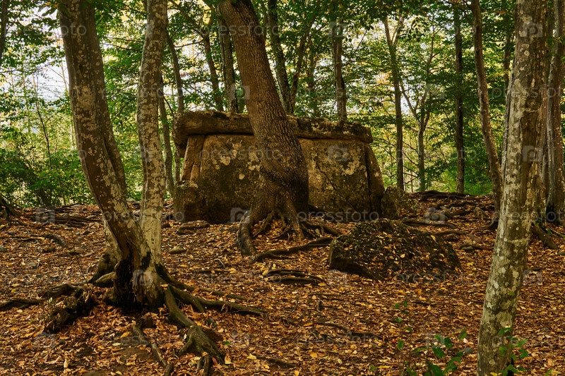 Древний дольмен мегалита среди деревьев в осенней роще