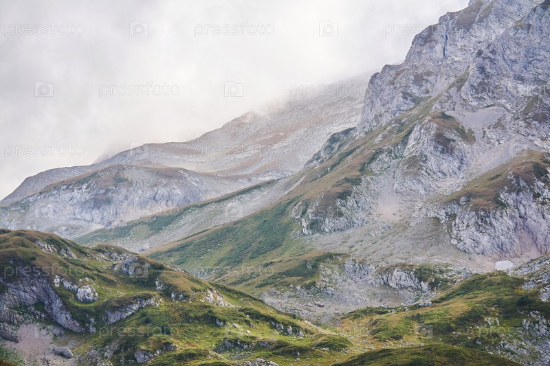 Красивый пейзаж осеннего кавказского нагорья с причудливыми склонами среди облаков