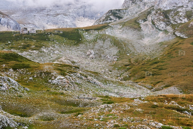 Горная долина с альпийскими лугами у линии снега на Кавказе