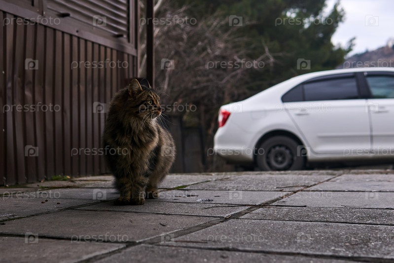 Пушистый серый бездомный кот в городской среде обитания