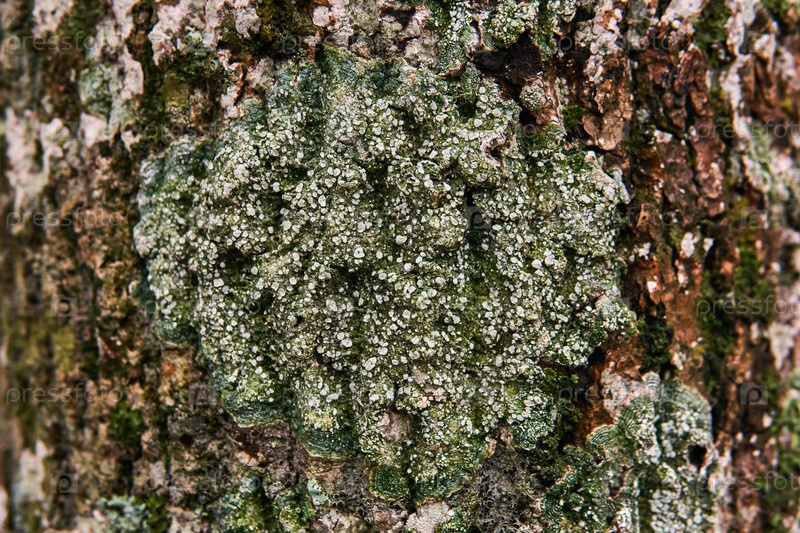 Спороносный лишайник на коре дерева крупным планом