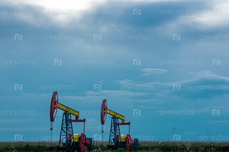 Насосные станции, работающие на нефтяной скважине в поле под облачным небом