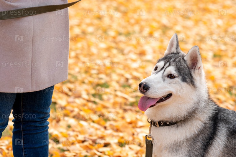 Портрет собаки хаски рядом со своим хозяином на фоне осенней листвы
