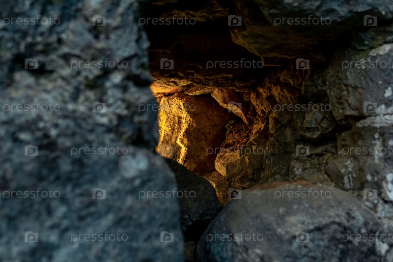 Амбразура в старой крепостной стене, сквозь которую пробивается свет, крупный план