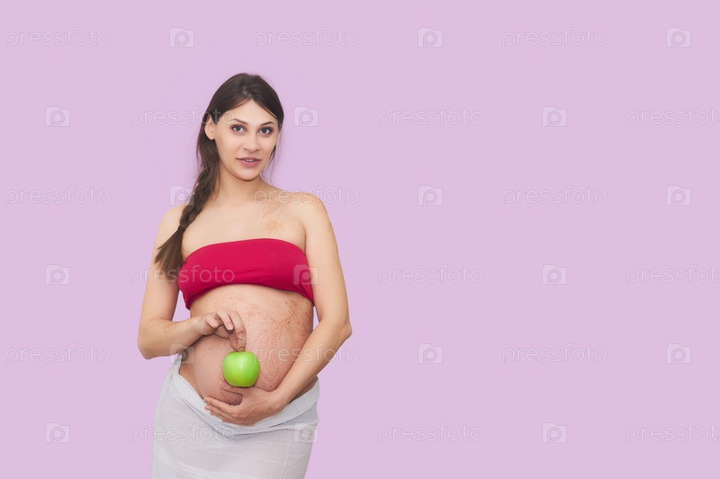 Молодая беременная женщина держит зеленое яблоко