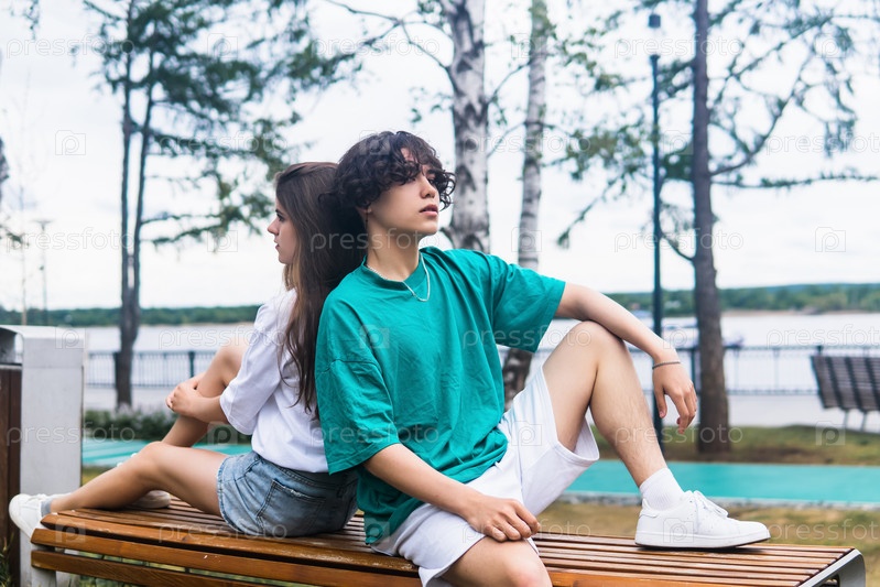 Двое молодых людей сидят на скамейке в парке
