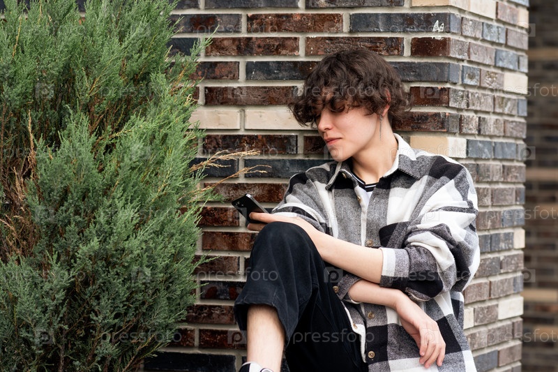 Молодой человек читает что-то по телефону, сидя на кирпичном бордюре