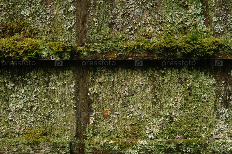 Стена старого деревянного сарая, покрытая плесенью, мхом и лишайниками