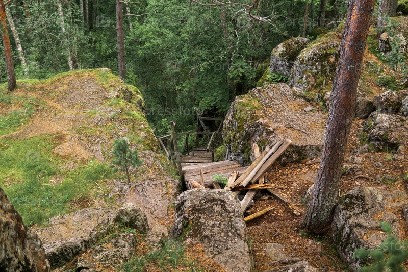 Разрушенная деревянная лестница на заброшенной тропе в горном лесу