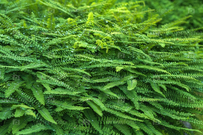 Фон растения, зеленые листья, папоротник нефролепис, покрытый росой