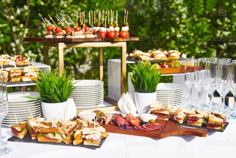 Фуршет под открытым небом, стаканы и бутерброды на шампурах перед началом праздника на фоне цветущих деревьев в саду