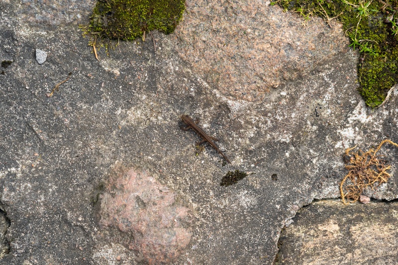 Маленький тритон выполз на камень в поисках убежища на суше