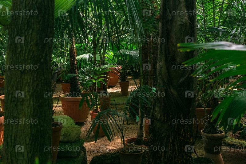 Интерьер большой теплицы с пальмами и другими тропическими растениями