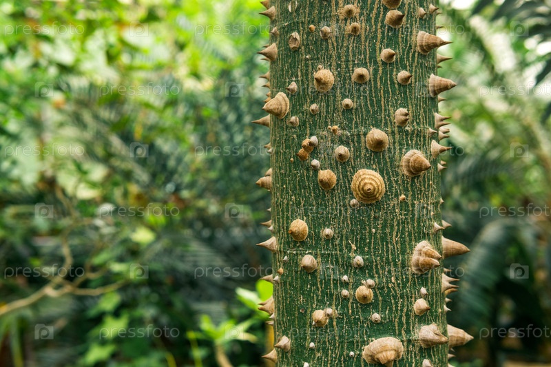 Ствол дерева Ceiba speciosa из шелковой нити, покрытый шипами на естественном размытом фоне