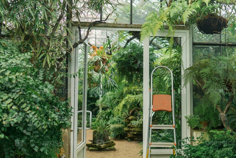 Интерьер большой оранжереи с коллекцией папоротников