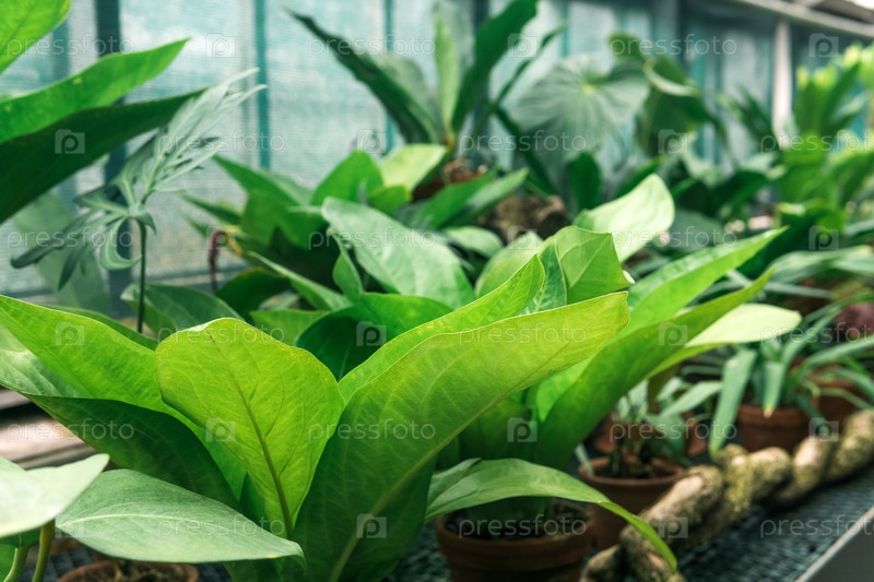 Свежие зеленые листья тропических растений в теплице крупным планом