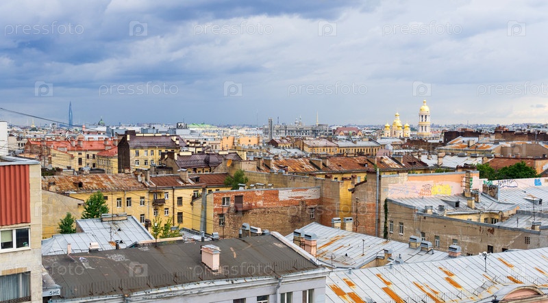Панорамный вид сверху на крыши города в историческом центре Санкт-Петербурга перед дождем