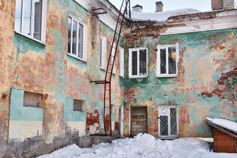 Фрагмент старого полуразрушенного здания с сугробами на заднем дворе