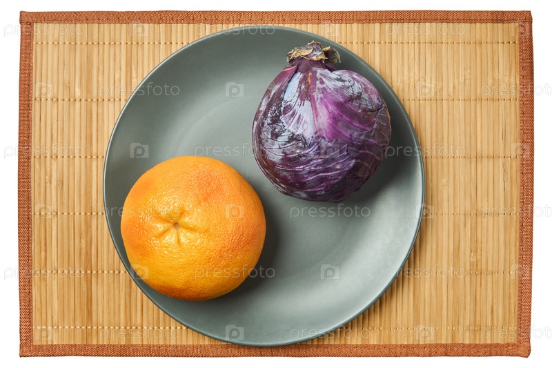 Фиолетовый кочан красной капусты и розово-желтый грейпфрут на серой тарелке на тростниковой скатерти