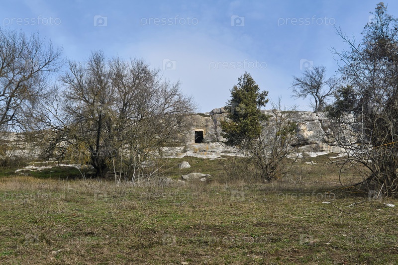 Пейзаж с древним пещерным жилищем в скале на заднем плане