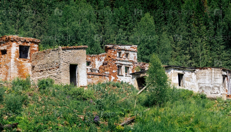 Руины старого кирпичного промышленного здания среди леса в горах