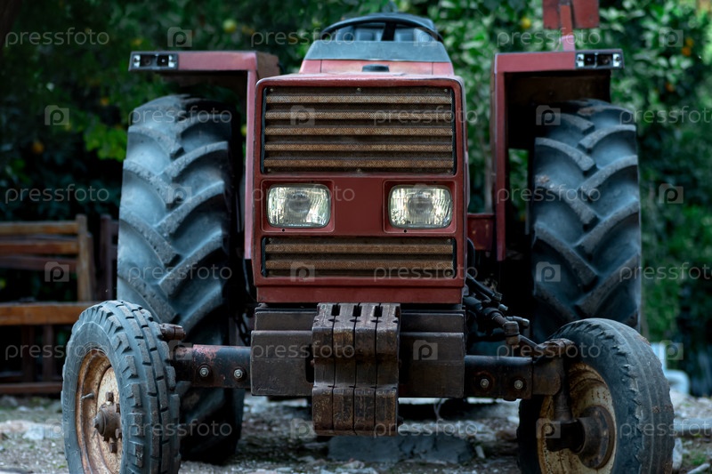 Небольшой колесный сельскохозяйственный трактор, вид спереди, крупный план