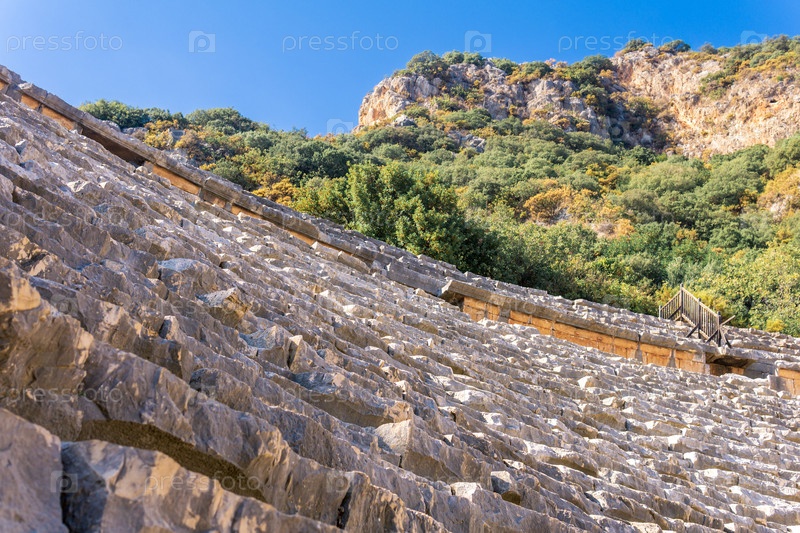 Вид с арены на ступенчатые трибуны высеченного в скале амфитеатра на руинах Миры (Демре, Турция)