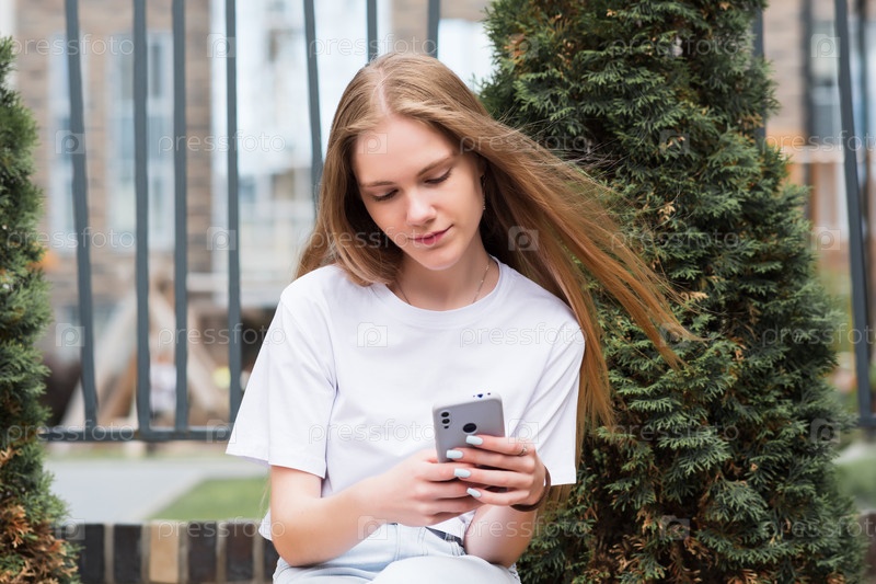 Молодая женщина с телефоном на фоне городского пейзажа