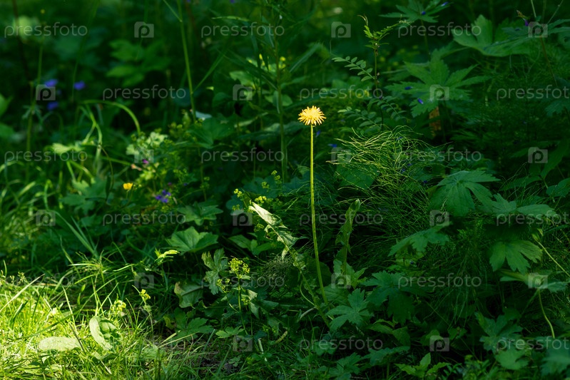 Ярко-желтый одуванчик среди сочной травы на лугу