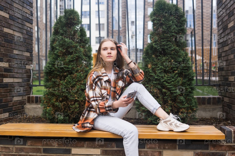 Молодая женщина сидит на уличной скамейке в городе с телефоном