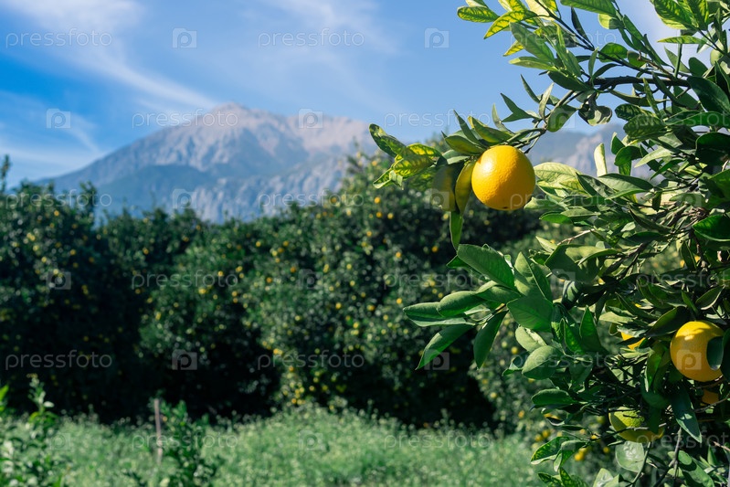 Апельсиновая плантация на фоне гор с фруктами на переднем плане