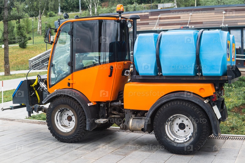 Небольшой автоцистерна для чистки дорожек и полива растений в городском парке