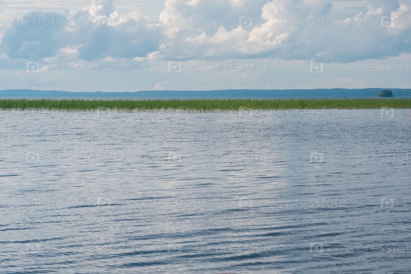 Природный ландшафт, огромное мелкое озеро с тростниковыми берегами в пасмурный день