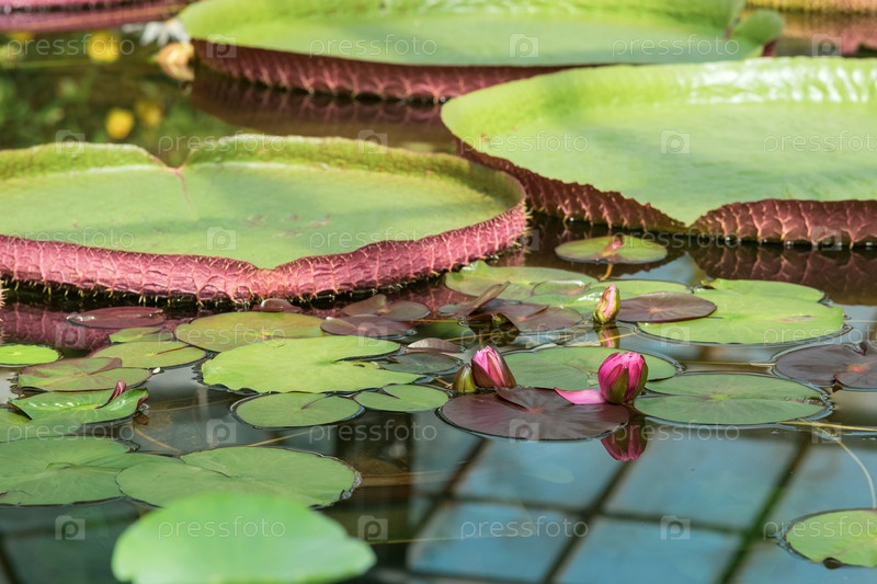 Фиолетовые бутоны тропической кувшинки перед цветением в тепличном бассейне