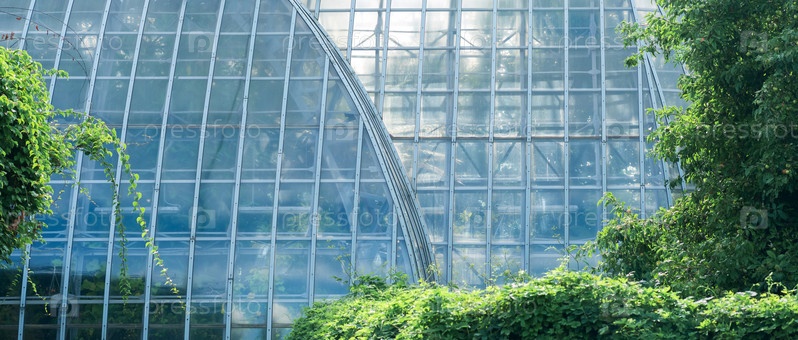 Вид на стеклянную стену большой старинной пальмовой теплицы за деревьями на открытом воздухе
