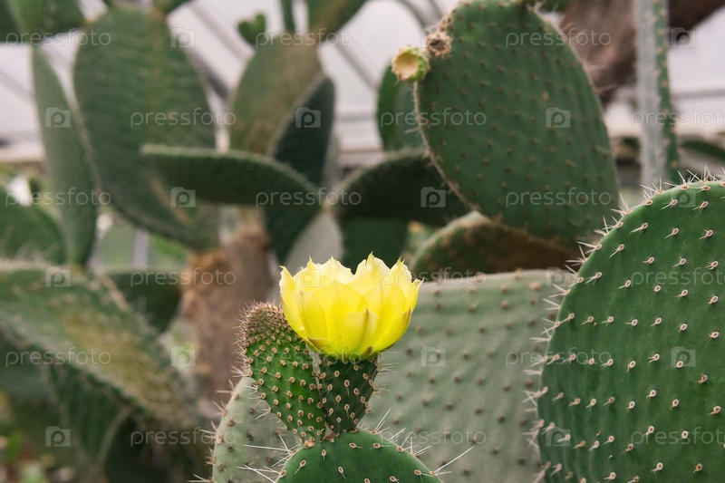 Листья кактуса опунции или опунции с желтым цветком