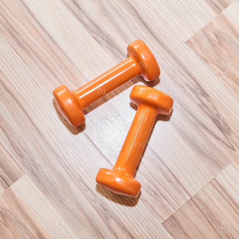 Пара маленьких оранжевых прорезиненных гантелей на полу