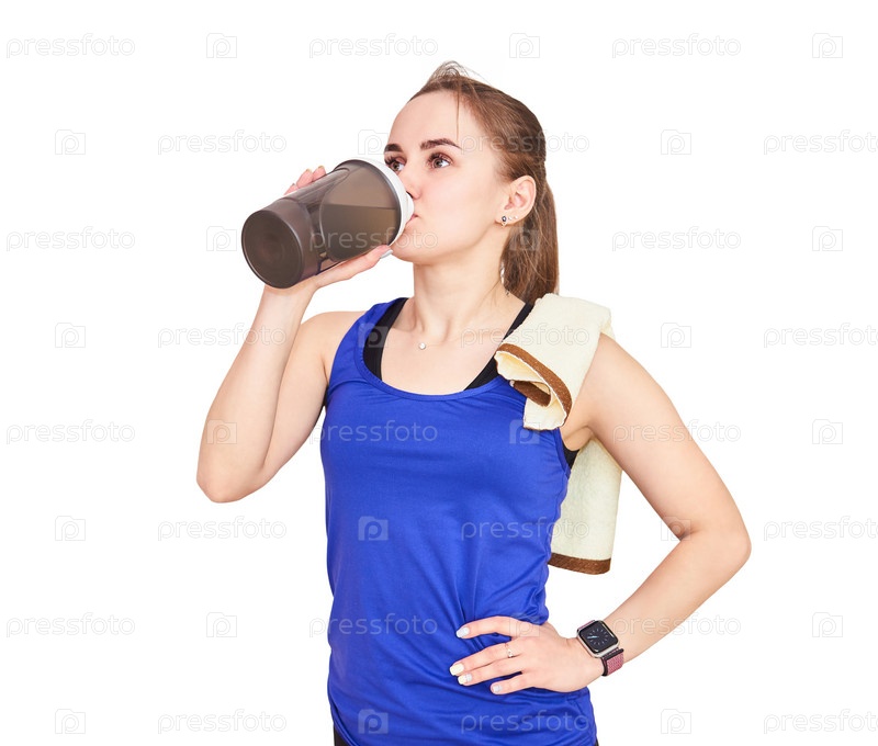 Молодая спортивная женщина с полотенцем пьет из шейкера спортивный напиток после тренировки, изолированная на белом фоне