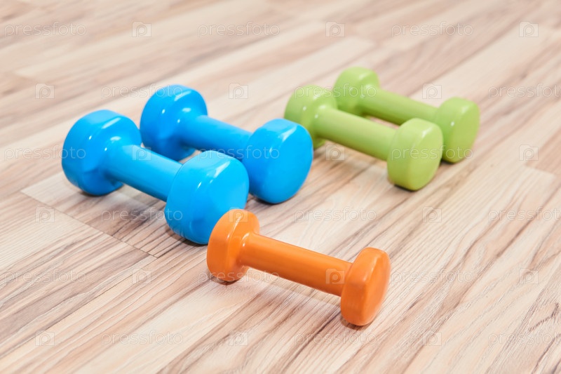 На полу лежат несколько прорезиненных гантелей разного веса и цвета