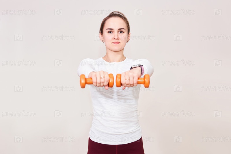 Молодая женщина выполняет упражнения с гантелями, держа их перед собой, на светлом фоне