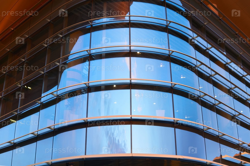 Фрагмент застекленного фасада современного здания с отраженным в нем небом