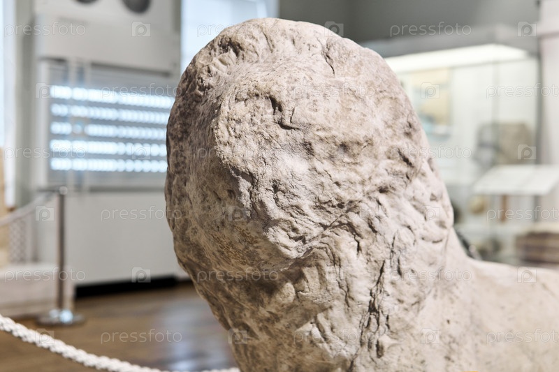 Голова поврежденной античной статуи льва в экспозиции исторического музея