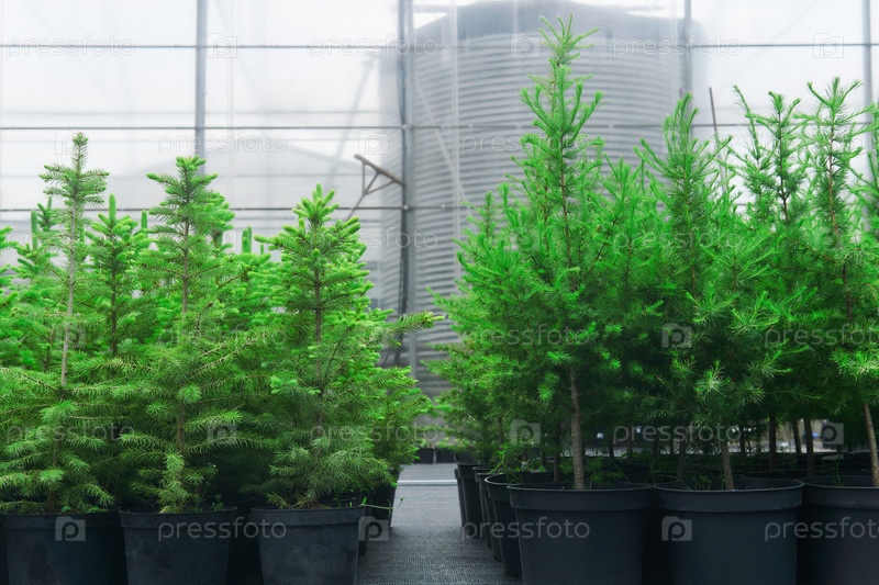 Саженцы ели, лиственницы и ели в горшках в питомнике возле теплицы