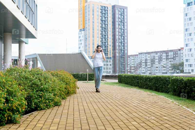 Девушка-подросток танцует под музыку в наушниках, идя по улице