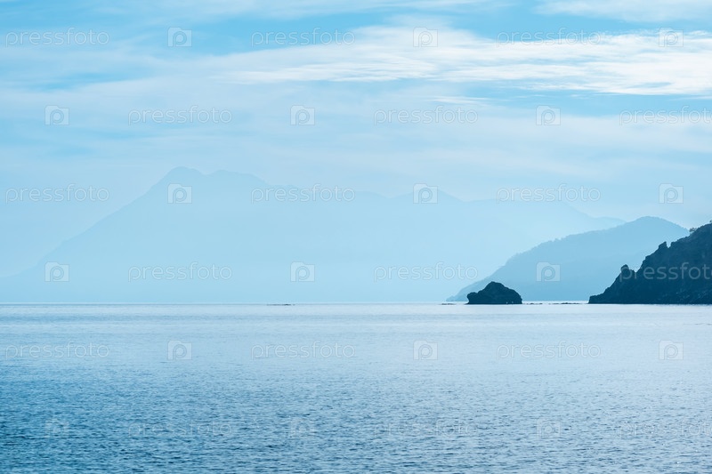 Туманный морской пейзаж с далекими гористыми берегами в полуденной дымке