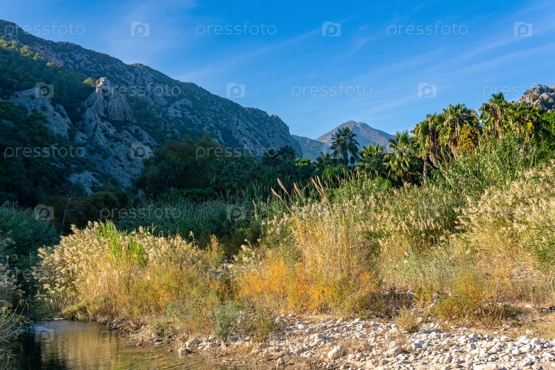 Тропический пейзаж, речная долина между горами с тростником и пальмами