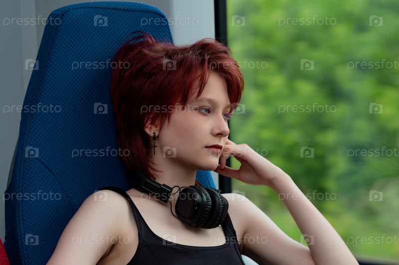 Молодая женщина в наушниках едет в движущемся пригородном поезде и смотрит в окно
