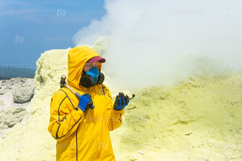 Женщина-вулканолог на фоне дымящейся фумаролы исследует образец серного минерала