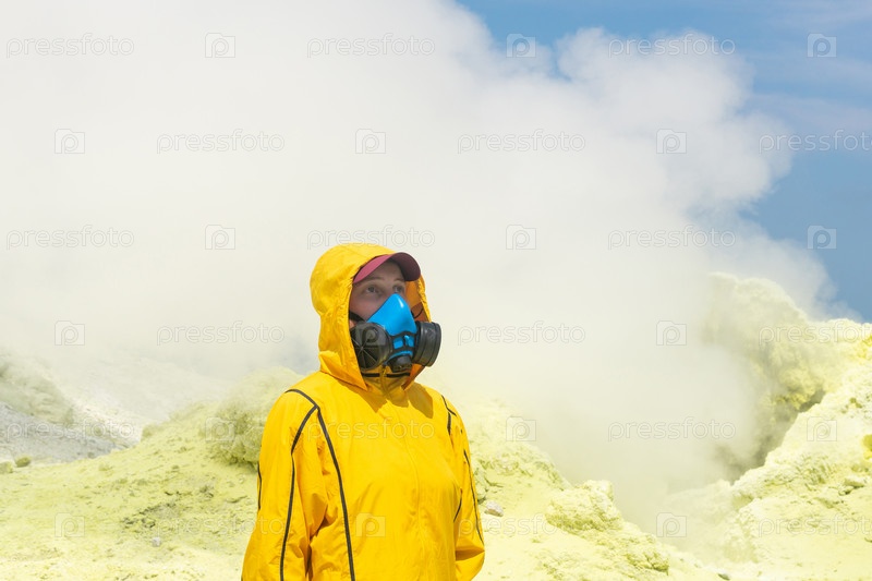 Женщина-вулканолог в респираторе на фоне дымящейся фумаролы на склоне вулкана