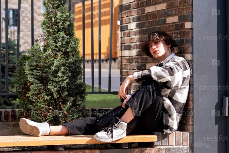 Молодой человек расслабленно сидит на городской скамейке